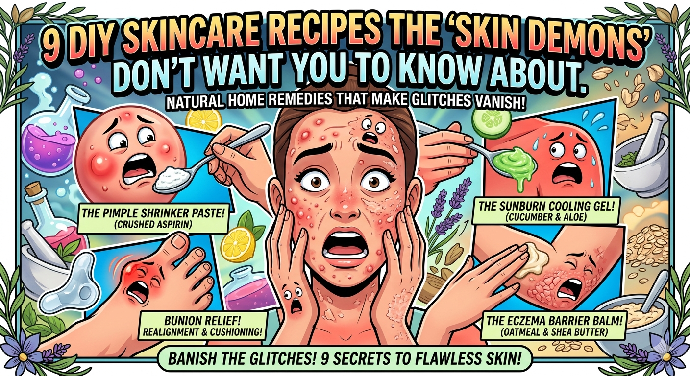 If you’ve seen our latest videos, you know that our everyday body glitches—from angry pimples to fiery sunburns—are absolutely terrified of the right DIY remedies. They beg, they scream, and they plead for you not to use these specific recipes on them, because they know exactly what will happen: they will disappear completely! You asked for the exact formulas used in the videos, and we are delivering. Here are the 9 simple, science-backed, homemade recipes that will clear up your skin and send those glitches packing. 1. The Pimple Shrinker Paste When a massive, red, swollen pimple ruins your morning, don’t pop it. Hit it with this homemade salicylic acid treatment. What you need: • 1 uncoated aspirin tablet • A few drops of warm water The Instructions: Crush the aspirin tablet into a fine powder using the back of a spoon. Add just enough water to create a thick, white paste. Dab this directly onto the pimple and let it sit for 10-15 minutes before rinsing it off. Why the glitch hates it: Aspirin contains acetylsalicylic acid. It dives straight into the pore, dries out the trapped oil, and forces the swollen bump to shrink away to nothing. 2. The Bug Bite Neutralizer Stop scratching! When a mosquito leaves an inflamed welt on your arm, this astringent paste shuts down the itch immediately. What you need: • 1 tsp baking soda • 1/2 tsp witch hazel The Instructions: Mix the baking soda and witch hazel in a small bowl until it forms a thick paste. Smear it directly over the bug bite, let it dry completely, and rinse. Why the glitch hates it: The baking soda neutralizes the acidic insect saliva, while the witch hazel acts as an astringent to draw out toxins, making the itchy welt completely disappear. 3. The Sunburn Cooling Gel If you stayed out in the sun too long and your skin is tight, red, and peeling, this freezing-cold, hydrating blend is your best friend. What you need: • 2 tbsp pureed cucumber (blended until smooth) • 2 tbsp raw aloe vera gel The Instructions: Mix the cucumber puree and aloe vera gel together. Keep the mixture in the fridge so it is freezing cold when you need it. Spoon it gently over the sunburned skin. Why the glitch hates it: Cucumber is packed with water and antioxidants, and aloe vera forms a protective barrier. Together, they soothe the burn, trap in healing moisture, and make the flaming red skin fade away. 4. The Scalp Flake Melter Dry, flaky scalp crusts ruining your dark shirts? You need an antimicrobial hydration bomb to melt them down. What you need: • 2 tbsp warm, melted coconut oil • 3-4 drops tea tree essential oil The Instructions: Blend the tea tree oil into the warm (not hot!) coconut oil. Use a glass dropper or your fingers to massage the mixture directly into your roots. Let it sit for 20 minutes, then shampoo your hair thoroughly. Why the glitch hates it: Coconut oil provides deep hydration to dry skin, while tea tree oil contains powerful antifungal properties that melt dead skin crusts and wipe out flakes entirely. 5. The Eye Bag Deflator Mask When exhaustion leaves you with swollen, dark purple under-eye bags, wake your skin up with a massive dose of topical caffeine. What you need: • 1 tsp finely ground coffee (fresh or used grounds) • 1 tsp raw honey The Instructions: Mix the coffee grounds and honey into a thick, dark paste. Using a small cosmetic brush or your pinky finger, paint the mask gently under your eyes (be careful to avoid getting it in your actual eyes). Leave it on for 10 minutes, then wipe it away gently with a damp cloth. Why the glitch hates it: The heavy caffeine constricts dilated blood vessels and drains trapped fluid, deflating the puffy bags completely. 6. The Kitchen Burn Soother Accidentally touch a hot oven rack? You need to seal the burn quickly to stop the throbbing pain. What you need: • 1 tsp raw honey • 1 drop lavender essential oil The Instructions: Mix the drop of lavender oil into the raw honey. Spread this sticky, golden ointment directly over the minor burn. Why the glitch hates it: Raw honey is a natural antibacterial humectant. It seals the wound from oxygen (which stops the stinging pain) while the lavender calms the inflammation, making the red mark disappear. (Note: Only use this on minor, superficial burns. Seek medical attention for severe burns.) 7. The Eczema Barrier Balm When your skin breaks out in dry, scaly, cracking eczema patches, standard lotion isn’t enough. You need to physically rebuild your skin’s barrier. What you need: • 1 tbsp finely ground colloidal oatmeal • 2 tbsp melted shea butter The Instructions: Melt the shea butter in the microwave or a double boiler. Whisk in the colloidal oatmeal until well combined. Let it cool until it forms a thick, creamy balm, then massage it directly into the scaly patches. Why the glitch hates it: The oatmeal soothes the fiery itch, while the heavy fatty acids in the shea butter rebuild the broken skin barrier, trapping the water inside and making the dry rash melt away. 8. The Stinky Foot Soak Foul foot odor is caused by bacteria thriving in a sweaty environment. To fix it, you have to destroy their habitat. What you need: • Warm water (enough to cover the soles of your feet) • 1/2 cup white vinegar • 1/4 cup antiseptic mouthwash (like original Listerine) The Instructions: Fill a shallow foot-bath or basin with the warm water, vinegar, and mouthwash. Dunk your feet in and let them soak for 15 to 20 minutes. Dry them completely afterward. Why the glitch hates it: The highly acidic vinegar and the alcohol/essential oils in the mouthwash completely destroy the sweaty, bacterial environment, eliminating the foul odor at its source. 9. The Wasp Sting Deflator A wasp sting pumps painful venom proteins into your skin. Instead of just icing it, break down the venom chemically. What you need: • 1 tsp unseasoned meat tenderizer powder • A few drops of water The Instructions: Mix the meat tenderizer powder with a 